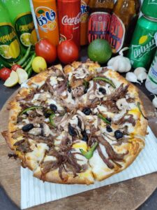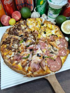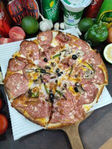 ژامبون گوشت و مرغ ، سس مخصوص ، قارچ ، فلفل دلمه ، پنیر موزورلا ، زیتون